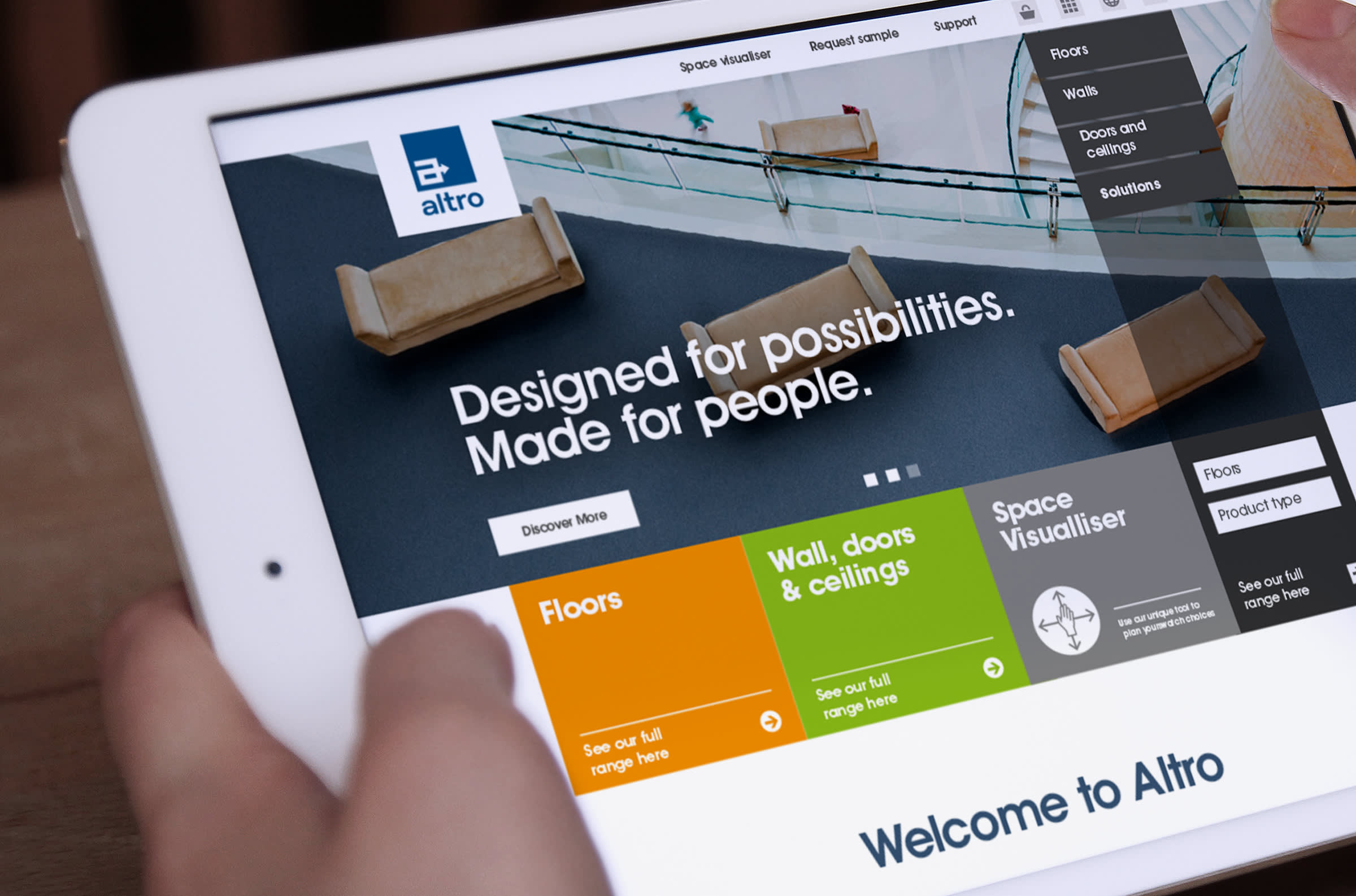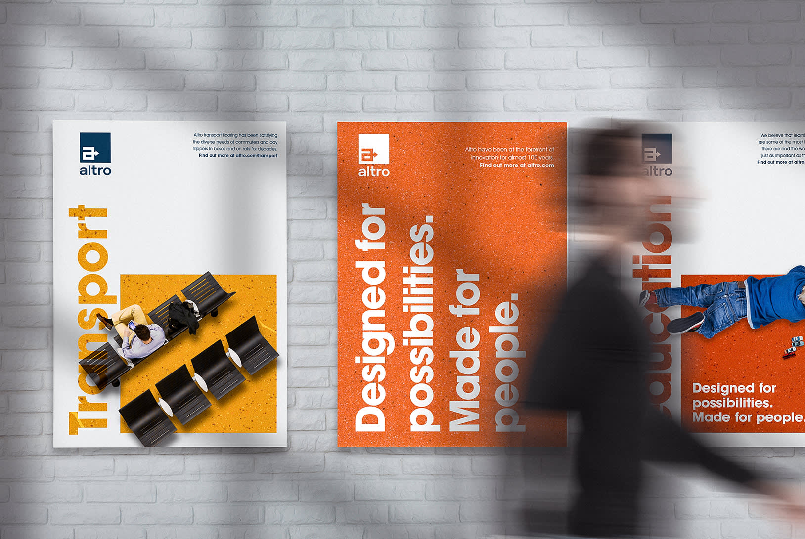Uffindell undertook global client research and developed a future fit brand platform. We identified a clear differentiator for Altro that both expressed their core strength of ‘intelligent design’ and the breadth of ‘possibilities’ that their range of products provided for their clients. ‘Designed for possibilities. Made for people’.