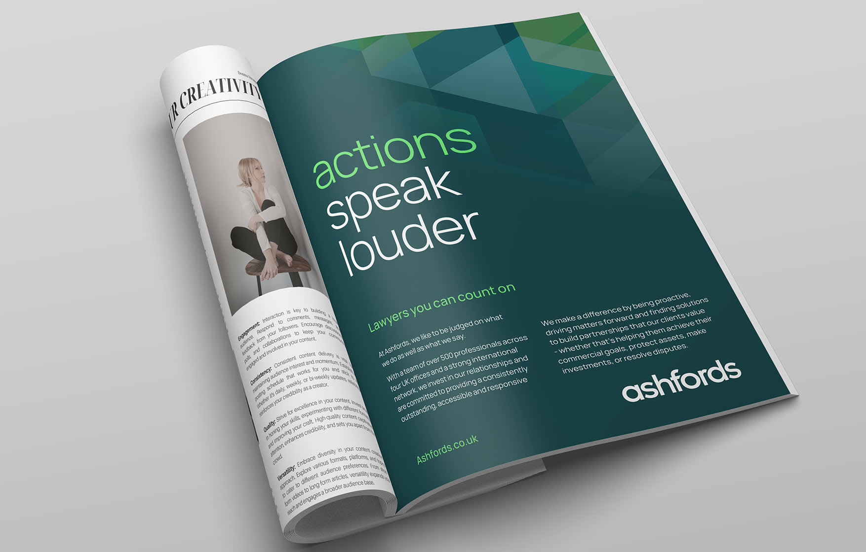 Uffindell were commissioned to develop a new brand identity for Ashfords LLP – a UK based Law Firm with offices in London and the South West of England. Working closely with the Ashfords leadership team to review and develop the brand strategy and identity in line with the ambitions of the organisation.